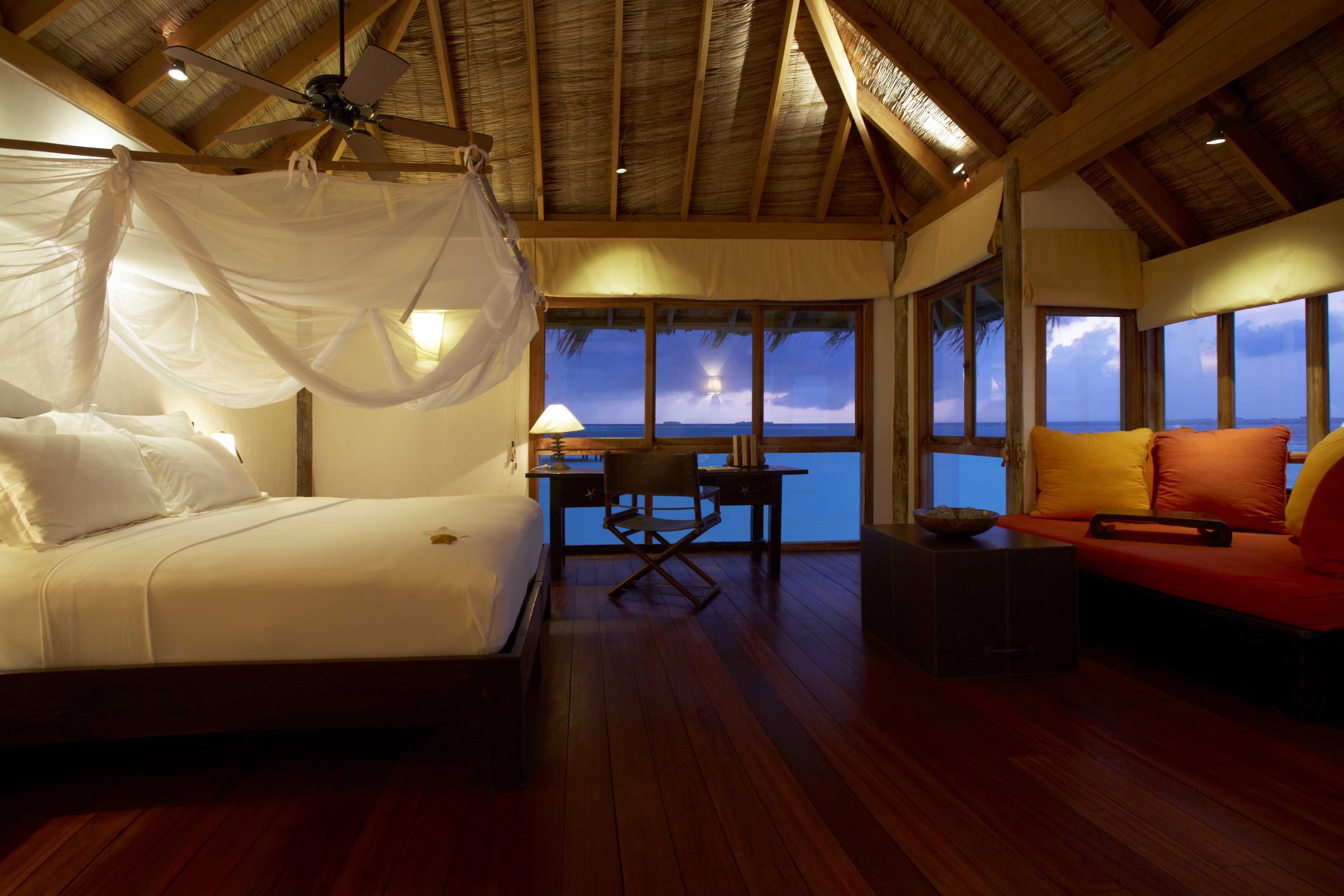 • The Crusoe Residence - Total area of 250sqm. Stand alone in the Indian Ocean, secluded for greater privacy. Your own private motorised boat to the island. Private overwater hammock. Large air conditioned living room with two large daybeds and a dining table. Rooftop terrace with daybed and dining table. Overwater sundeck with sun loungers and a King size bed. Mini wine cellar. Semi open-air private bathroom with seperate glass walled shower area. latest audio visual offering and WI-FI if you really need it.